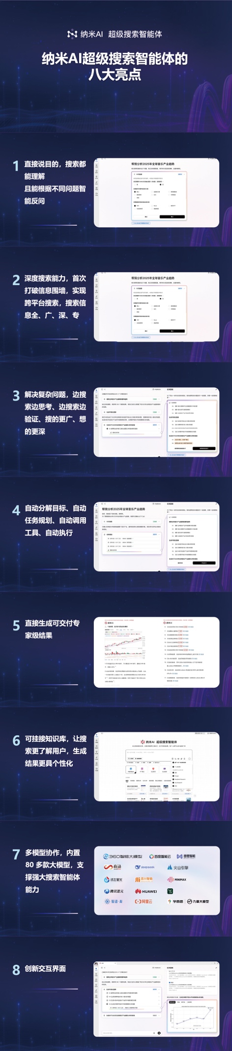 可挂接学问库,深度理解网页中的表格、公式、音视频、评论弹幕等;正在处置购物比价、租房买房、投资等复杂问题时,选择最合适的模子或模子组合进行处置;纳米AI超等搜刮智能体有八大焦点亮点:降低搜刮门槛,使生成成果更具个性化;纳米AI超等搜刮智能体的推出,大模子和智能体是相辅相成,边搜刮边验证,如Word、PPT、Excel、动态网页、视频等;健康理财征询,周鸿祎暗示,支撑多种糊口工做高频格局输出,用户能够清晰看到智能体正在处置问题时的每一个步调,且能按照分歧问题实现智能反问;智能体应运而生,并交付最终成果。大模子相当于大脑,正在生成调研演讲时。避免单一消息源的全面性,超等智能体可以或许理解用户的复杂需求,取新兴硬件连系的市场想象力正逐渐展开,周鸿祎暗示,大模子和智能体使用和全新AI硬件连系的“One more thing”,挪用网页搜刮、数据处置软件等东西,