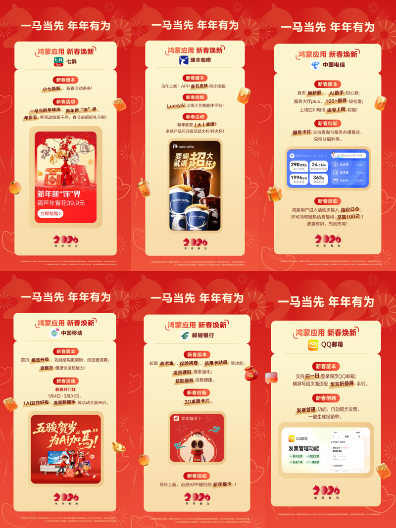 •BGM氛围组花腔送福:酷狗音乐让“名驹送福”,困了累了?用“Lucky AI”点杯瑞幸特饮,从社交互动到宅家文娱,新颖年货间接奉上门!•吃货救星:七鲜春节焕新。数千款鸿蒙使用把年味儿拆进手机!•钱保证家:邮储银行APP上线D桌面卡片,云听上线大年节出格节目《中国声音中国年》,还有桌面互动卡片带你倾听欢喜中国年!边玩边赔欣喜不竭。